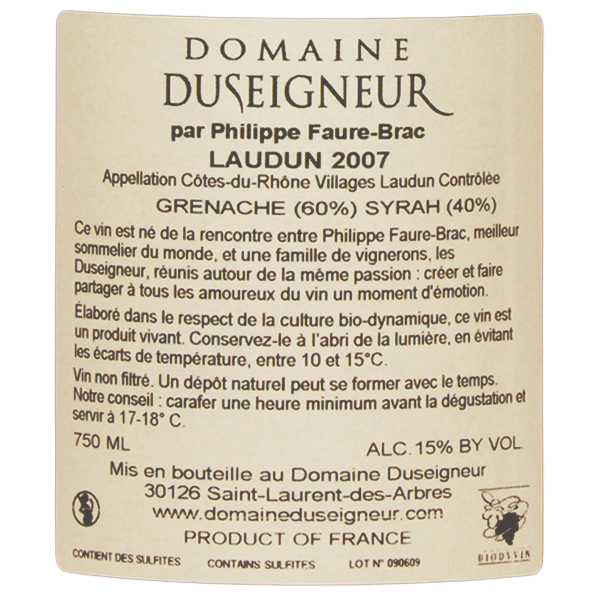 Ce vin a été élaboré pour être la cuvée d’exception du Domaine Duseigneur. Élaboré avec soin à partir de deux grands cépages du Rhône sud, ce vin mêle des arômes de fruits rouges et noirs avec de jolies épices.